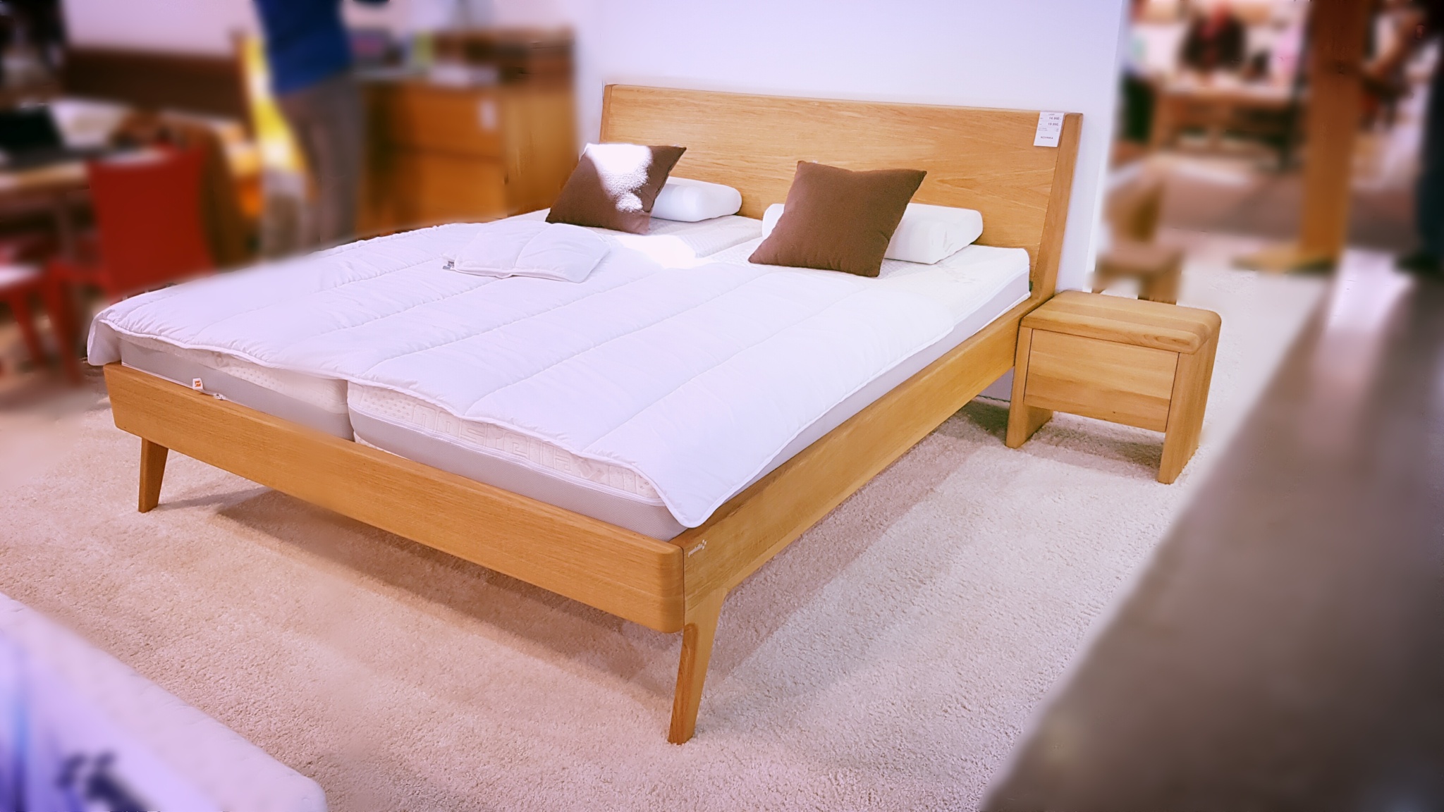 Postel z masivu ADRIA – Vyberte si mezi bukem a dubem s elegantním zahnutým hlavovým čelem. Robustní konstrukce z tvrdého dřeva o tloušťce 4 cm a výplň čela 2 cm zajišťují dlouhou životnost. Kování Hettich s doživotní zárukou a povrchová úprava 100% přírodním olejo-voskem od BIOFA poskytují spolehlivost a krásu. Dostupné v různých barevných variantách oleje, s výškou čela 100 cm pro maximální pohodlí.