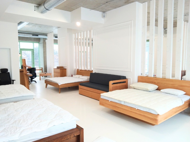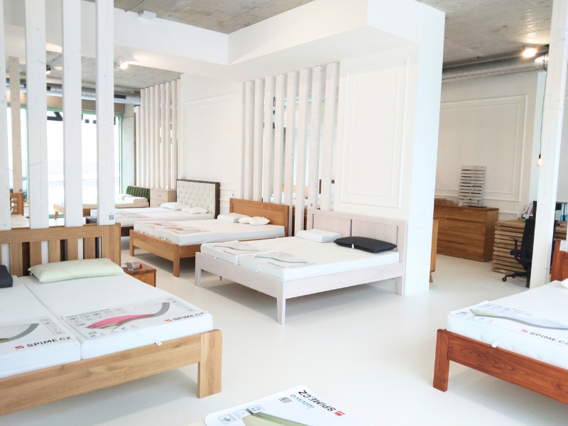 V nové prodejně bude vystaveno 18 postelí z masivu, vyzkoušet si můžete přes 30 typů zdravotních matrací a lamelových roštů.