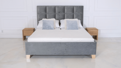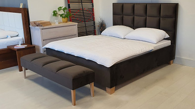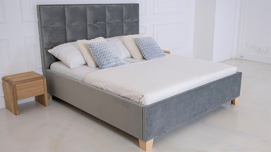 Spojení bočnic a čel je provedeno postelovým kováním od značkového výrobce Hettich a dřevěnou nohou postele, která má tvar do písmene L a je přichycena vruty do bočnice i čela. Výška bukové nohy je 11 cm. Uprostřed drží rošty masivní středová lať s výškově nastavitelnou nohou. Postel se skládá z bočnic, nožního čela, hlavového čela a středové latě. Systém závěsného kování umožňuje snadnou montáž i demontáž. Provedení na foto látka VELVET 2215 .