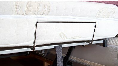 Chromový držák matrace, který se pouze zahákne za nožní část roštu a tím zajišťuje lepší stabilitu matrace. Zbraňuje jejímu posunutí mimo rošt.