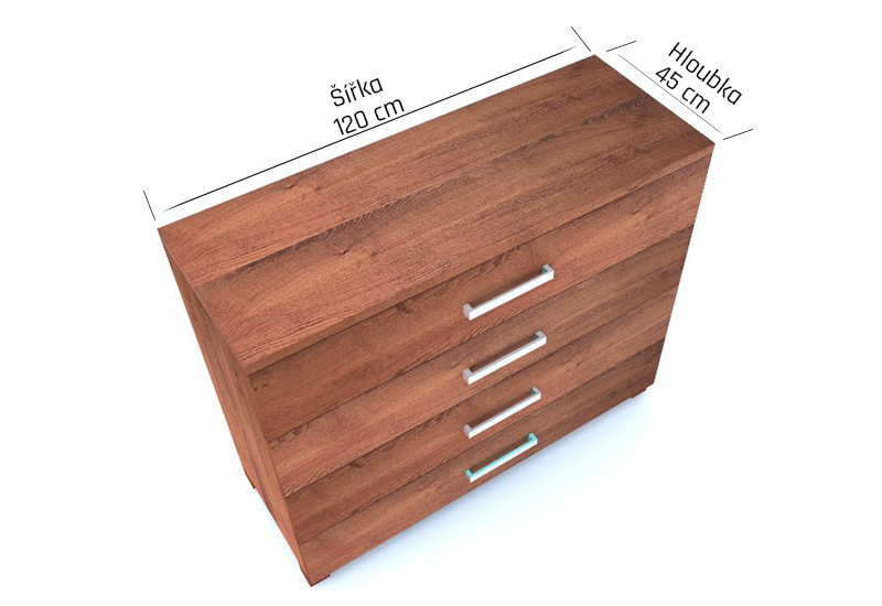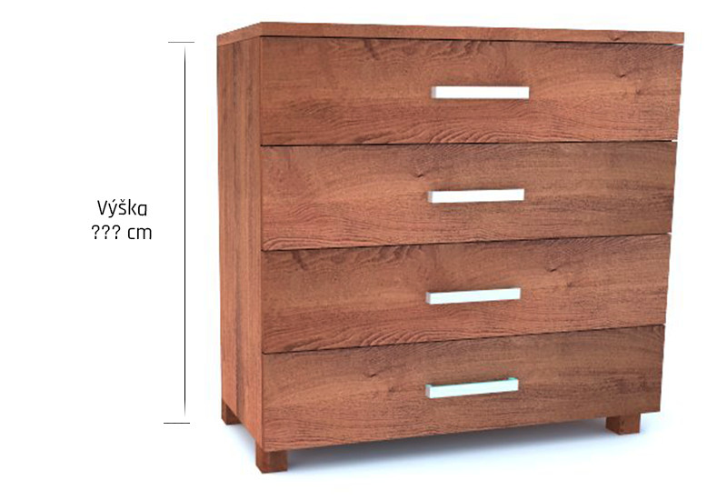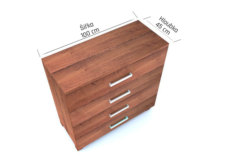 • Základní výška po horní desku komody je 100 cm, rozměr komody je šíře 100 cm, hloubka 45 cm.