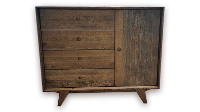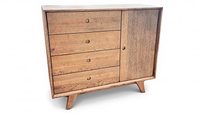 Robustní konstrukce z masivního dřeva o tloušťce 4 cm je na čelní hraně elegantně ztenčená, což dodává nábytku vzdušný a vytříbený vzhled. Dokonalá kombinace zásuvek a dvířek s policí. Na výběr provedení levé či pravé orientace komody.