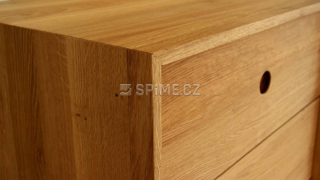 Na přání zákazníka vyrobíme komodu v jakémkoliv rozměru. Kalkulaci na jiný rozměr Vám sdělíme obratem. Boky komody jsou z masivu o šíři 4 cm, stejně tak horní a dolní deska, které jsou v přední části pohledově zúženy na 2 cm. Čela šuplíků jsou z masivu o šíři 2 cm. Vnitřek zásuvek je standardně z lamina v přírodním odstínu, ale za příplatek je možné zvolit masivní dýhu z Buku nebo Dubu, olejovanou na stejný odstín jako korpus komody. Dna zásuvek jsou standardně z bílého sololitu, s možností volby masivní dýhy z Buku nebo Dubu, také olejované na stejný odstín jako korpus komody, za příplatek.