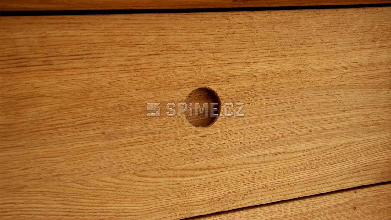 Minimalistický vzhled: Ovládání zásuvek zajišťují decentní frézované úchytky, které nahrazují klasické, což umožňuje zachovat čistotu designu nerušenou. Tento detail přispívá k minimalistickému a elegantnímu vzhledu komody.