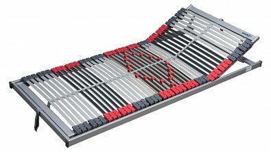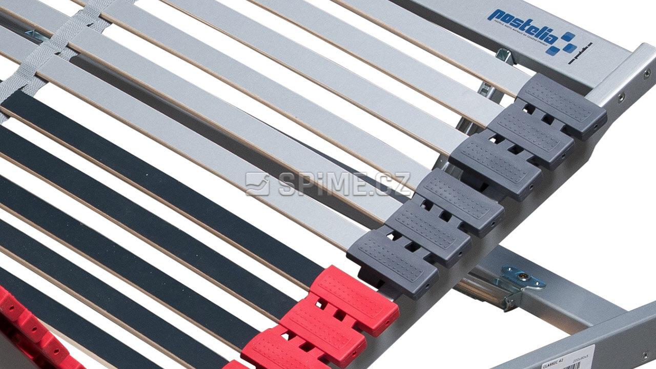 Velmi kvalitní lamelový rošt CLASSIC 42 manuálně polohovatelný v oblasti hlavy i nohou a s pístovým výklopem v nožní části pro snadný přístup do úložného prostoru v postele. Výkyvné lamely šíře 2 cm, uložené v kvalitních trojitých kaučukových aktivních pouzdrech, která sami sklesávají při zatížení a dotvářejí tak tvárnost lamel. Možnost nastavení tuhosti lamel ve střední části.