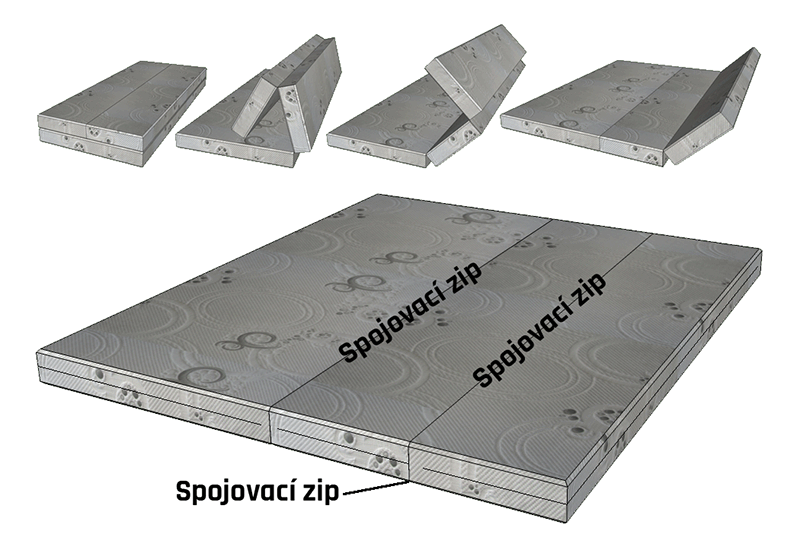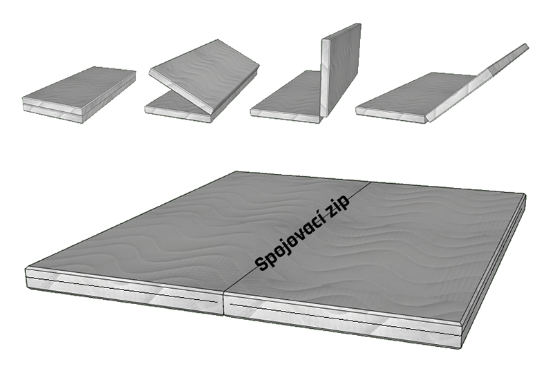 Zip (bezpříplatkový): Základní zip na potahu se liší dle základní výbavy matrace. Zip "do L" umožní rozepnout jednu krátkou a dlouhou stranu. Zip "dokola" umožní rozepnout celý obvod a rozdělit potah na dvě části. Dvě strany - zip do L + spojovací zip