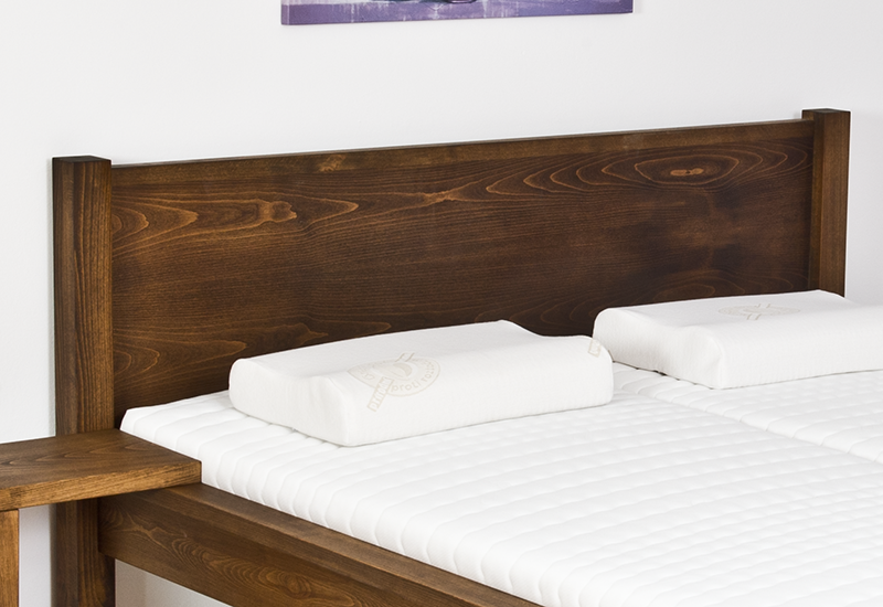 Spojení bočnic a čel je provedeno postelovým kováním od značkového výrobce Hettich. Uprostřed dvoulůžka drží lamelové rošty masivní středová lať s výškově nastavitelnou nohou. Manželská postel se skládá z bočnic, nožního čela, hlavového čela a středové latě pro umístění lamelového roštu. Systém závěsného kování postele umožňuje snadnou montáž i demontáž. Provedení na foto Moření Ořech + AU Lak.