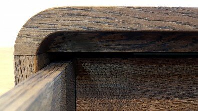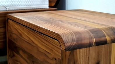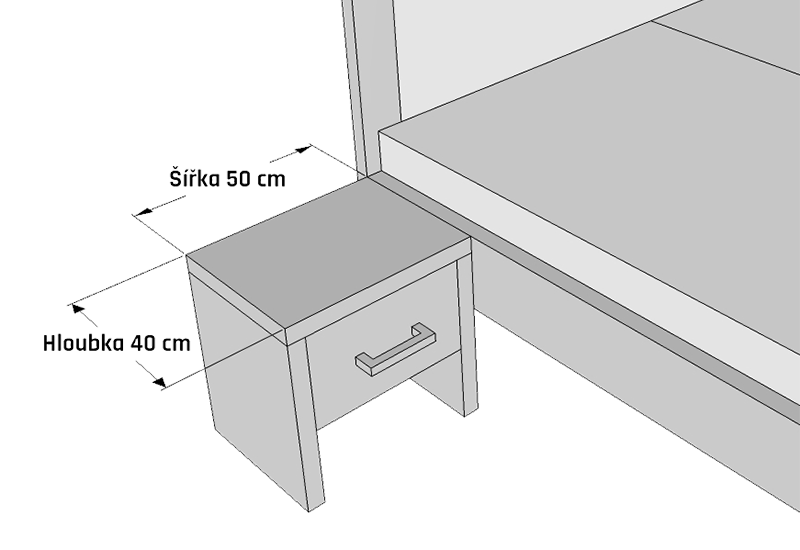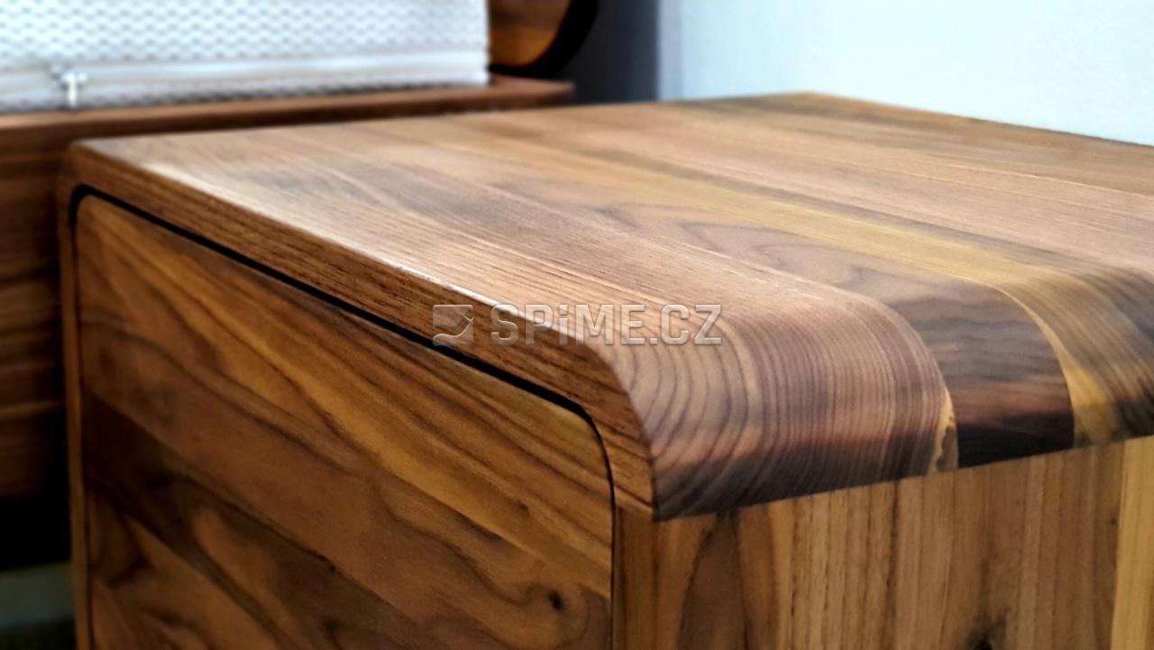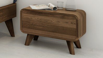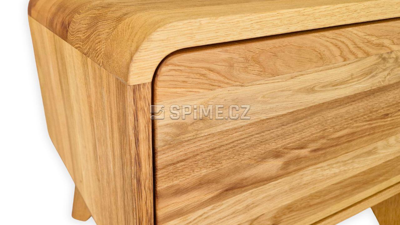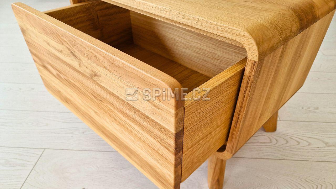 Designový noční stolek z masivu DEIRA je tvořen zaobleným masivním rámem o šíři masivu 2 cm / 4 cm. V základu je noční stolek s jedním šuplíkem. Provedení masiv Buk nebo za příplatek Dub. Základní výška po horní desku stolku je 45 cm, rozměr stolku je šíře 50 nebo 60 cm, hloubka 40 cm. Nožičky stolku jsou vysoké 15 cm. Na přání uděláme stolek v jakémkoliv rozměru. Kalkulaci na jiný rozměr Vám sdělíme obratem. Boky nočního stolku jsou z masivu o šíře 2 cm, horní a dolní deska jsou z masivu 4 cm (v přední části pohledově zúžené na 2 cm), čela zásuvek jsou z masivu šíře 2 cm a vnitřek zásuvek je z lamina Buk v přírodním odstínu nebo za příplatek z masivní dýhy Buk nebo Dub olejované na stejný odstín jako je korpus stolku. Dna zásuvek jsou z bílého sololitu a nebo za příplatek z masivní dýhy Buk nebo Dub také olejovaná na stejný odstín jako je korpus stolku. Výsuvné kování je pístové od Blum. Varianta kování TIP-ON funguje na namáčknutí čílka nočního stolku.