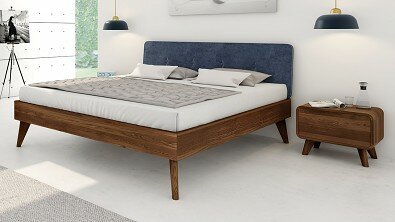 Postel z masivu DEIRA dvoulůžko. Celomasivní dřevěná postel o šíři masivu 4 cm s čalouněným čelem.
