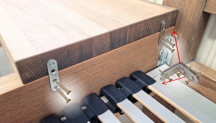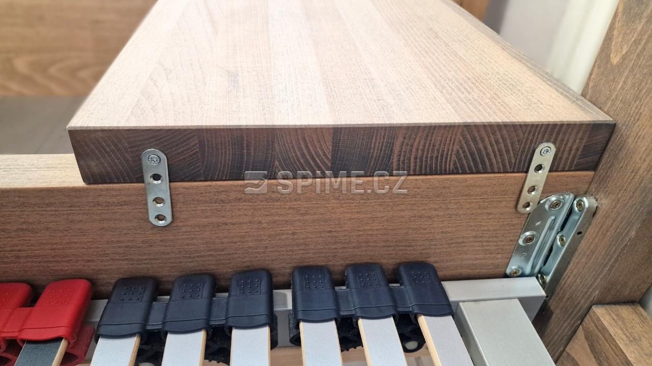 Konstrukce stolku je určená pro opření o horní hranu bočnice postele, součástí stolku je kování pro uchycení na bočnici, které je nutné přichytit vrutem.