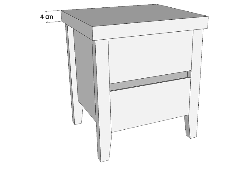 Noční stolek z masivu IBIZA je tvořen z masivní horní deskou o šíři masivu 2,8 cm nebo dle výběru 4 cm. Výběr z masivu Buk nebo Dub. Základní výška po horní desku stolku je 45 cm, šíře je 40 cm, hloubka 35 cm. Noční stolek je vyroben z masivu, boky stolku jsou z masivní dýhy a vnitřní konstrukce zásuvky je z lamina přírodní Buk nebo Dub. Dno zásuvky je z bílého sololitu. Záda nočního stolku jsou nepohledová (přírodní sololit.) Výsuvné kování je rolničkové, nebo s příplatkem ložiskové výsuvy Quadro®, nebo Quadro Silent®(samodobržďovací). Kování je od Německého výrobce Hettich®. Noční stolek lze zvolit s frézovaným úchytem, nebo lze vybrat některé z madel od značky SIRO®