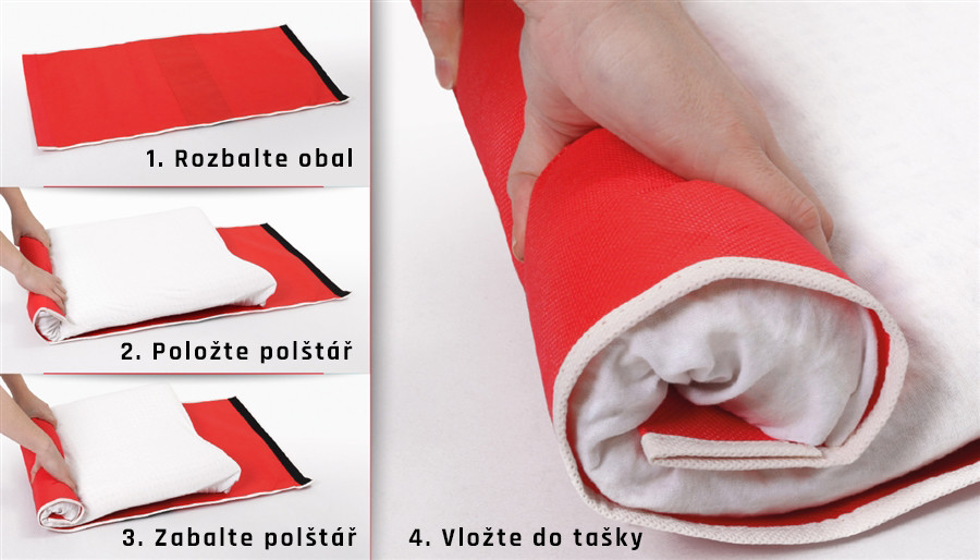 Jednoduché, praktické a velmi rychlé balení polštáře Rolling Serenity Vám ve čtyřech rychlých krocích umožní zabalit polštář na jakoukoliv cestu. Už není třeba se trápit na cestách bez kvalitního polštáře.