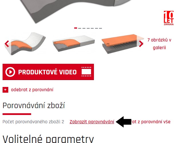 Stačí kliknout u vybraného produktu na tlačítko „+ přidat k porovnání“ a následně zvolit libovolné další matrace. Po kliknutí na „Zobrazit porovnání“ se vám všechny parametry přehledně zobrazí v tabulce.