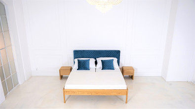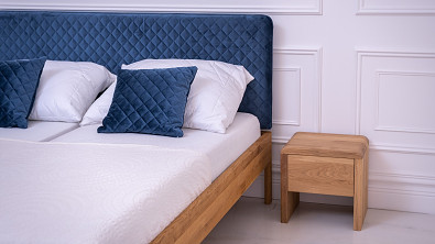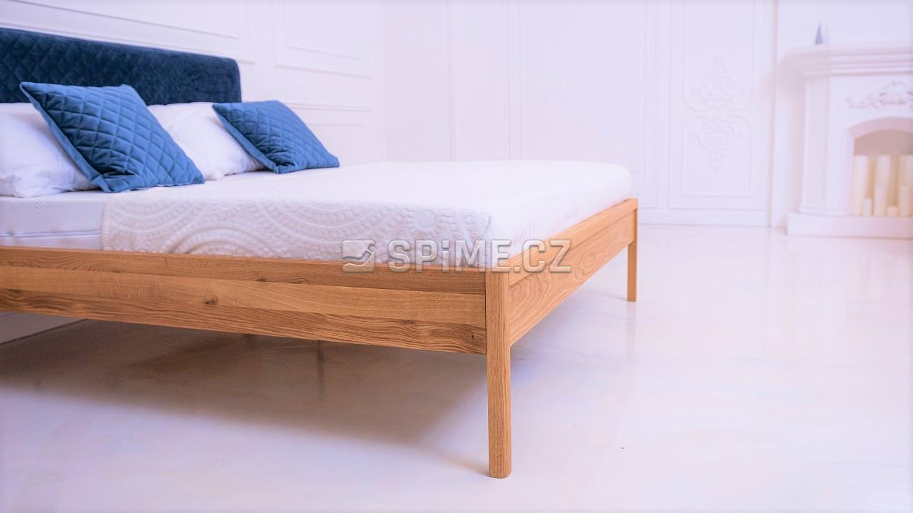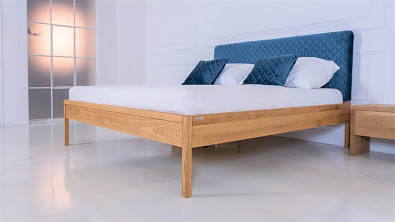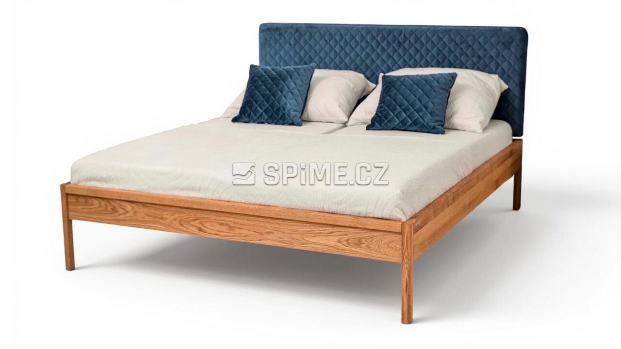 Postel z masivu DEIRA dvoulůžko. Celomasivní dřevěná postel o šíři masivu 4 cm s čalouněným čelem.