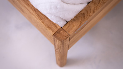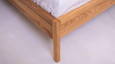 Spojení bočnic a čel je provedeno postelovým kováním od značkového výrobce Hettich zaručující dokonalou pevnost spoje a přichycení nosné nohy. Uprostřed drží rošty masivní středová lať s výškově nastavitelnou nohou. Manželská postel se skládá z bočnic, nožního čela, hlavového čela a středové latě. Provedení na foto Odstín: Olej BIOFA transparentní, Odstín čalounění: KARO 37.