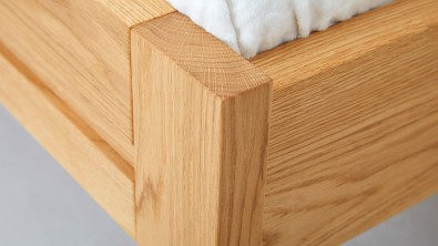 Spojení bočnice a čela je provedeno postelovým kováním od Hettich. U středu postele z masivu drží rošty masivní středová lať s výškově nastavitelnou nohou latí pro dvoulůžko - manželské postele). Postel se skládá z bočnic, nožního čela, hlavového čela a středové latě. Systém závěsného kování umožňuje snadnou montáž i demontáž. Postel je opatřena přírodní povrchovou úpravou od Německého výrobce BIOFA - směs přírodních olejů a pryskyřic s vysokým obsahem včelího vosku, nebo lze zvolit Polyuretanový lak, který lze kombinovat s barevným mořením. Provedení na foto Olej BIOFA Transparent přírodní odstín.