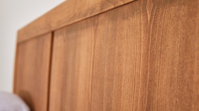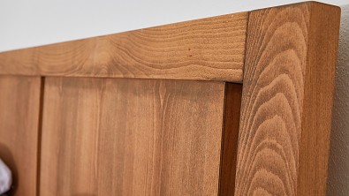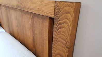 Hlavové čelo postele GITA je s masivním rámem, na kterém je připevněna deska z vrstvené dýhy (překližky). Masivní vrstvená dýha je připevněna na masivních příčkách, tedy žebrech, které masivní desku dokonale drží a zabraňují v průhybu. Hlavové čelo má v základu výšku 90 cm, s příplatkem si můžete dopřát 1 m vysoké čelo a za příplatek můžete mít i ohýbané čelo (na fotografii), které je v základní verzi bez příplatku rovné.