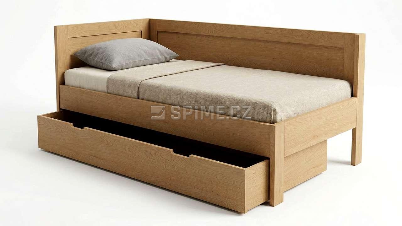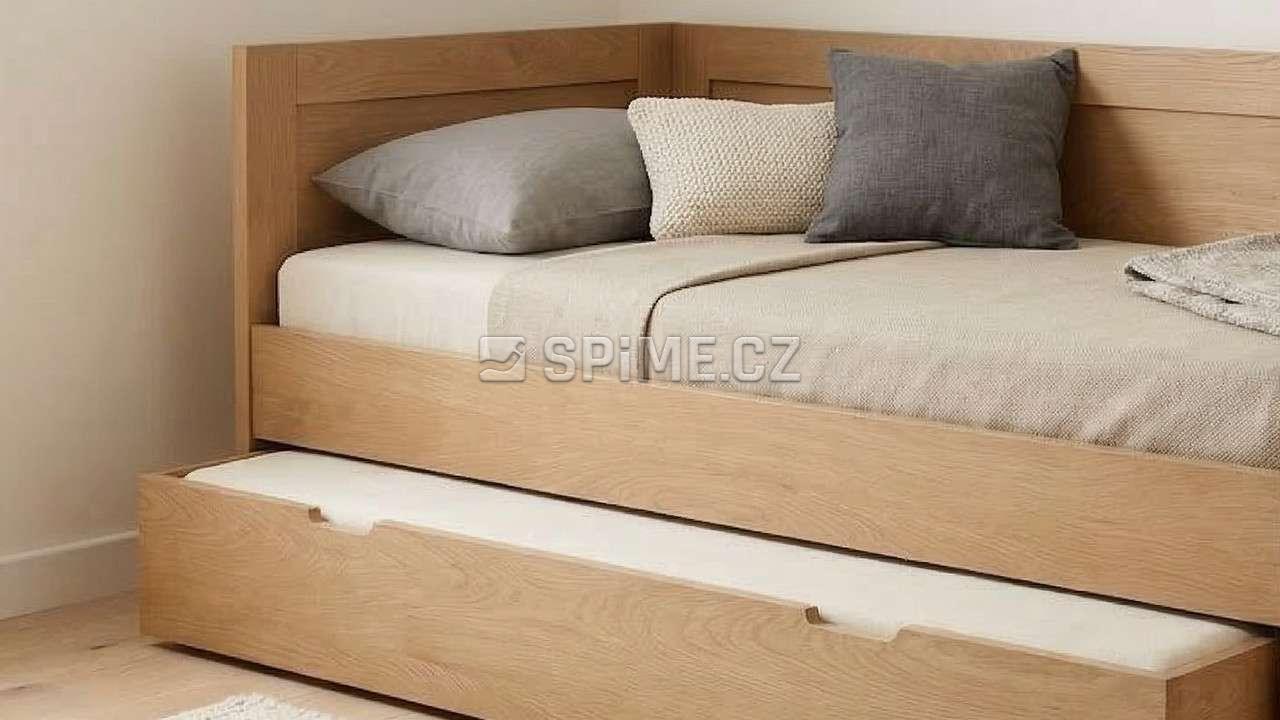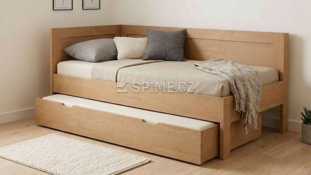Postel z masivu PAVEL do L jednolůžko se zvýšenou boční stranou a s přistýlkou. Čela s výplní šprušlemi.