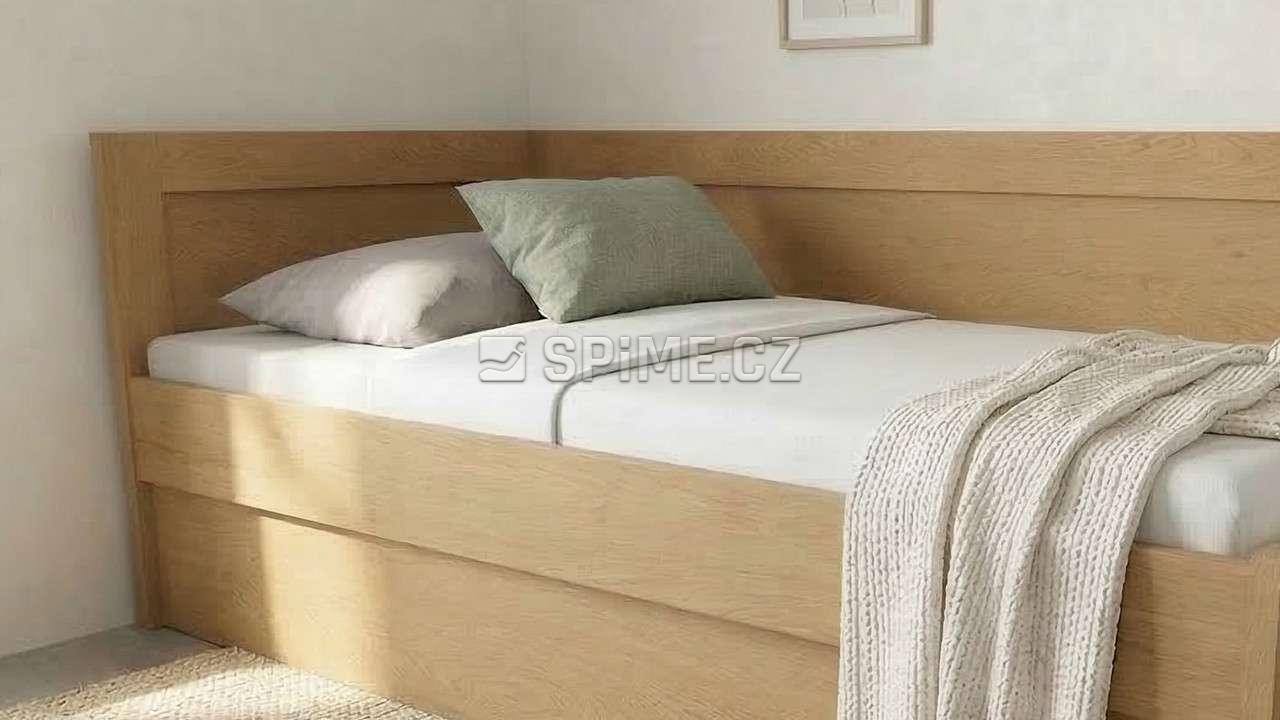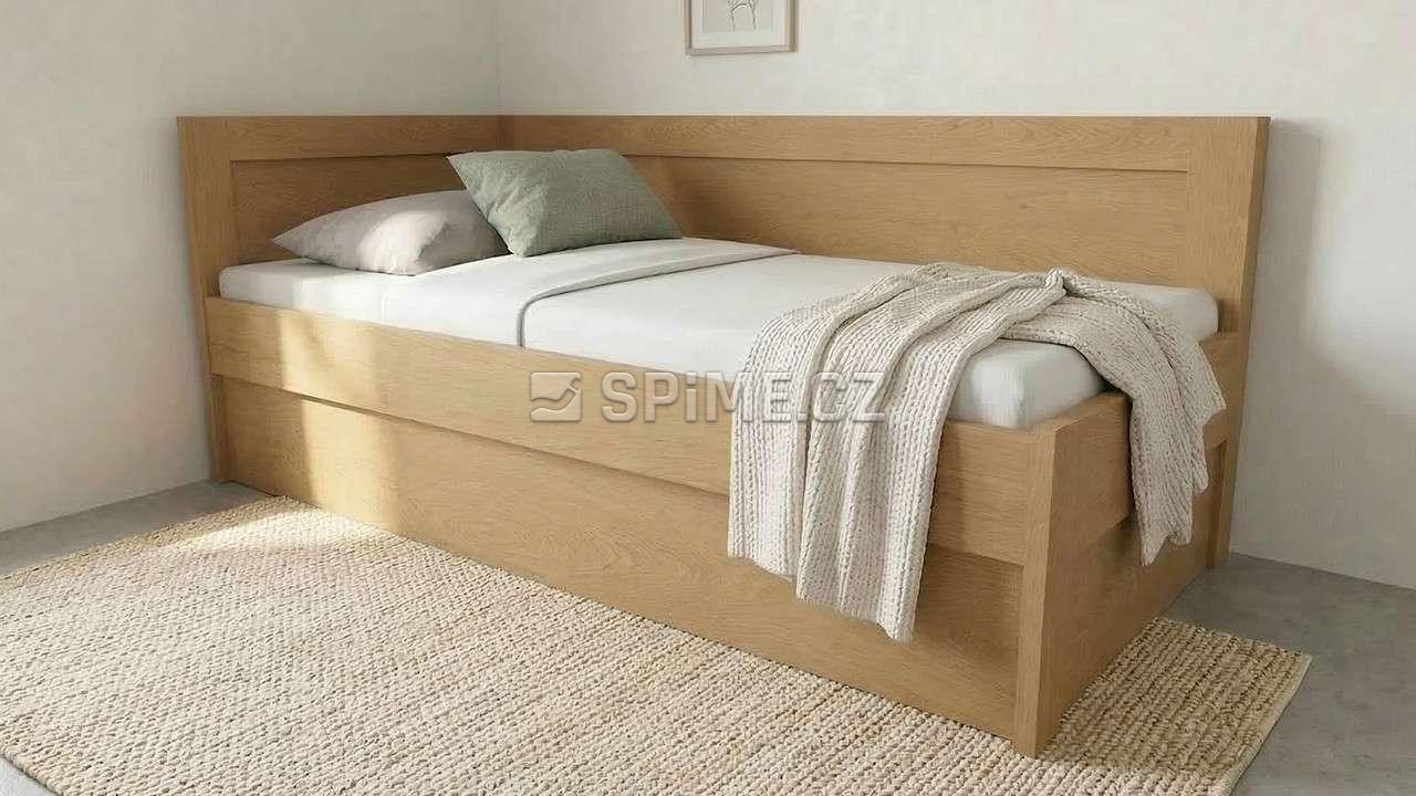Postel z masivu PAVEL do L jednolůžko se zvýšenou boční stranou a úložným prostorem. Čela s výplní šprušlemi.