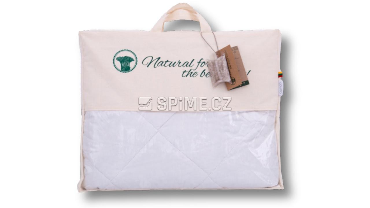 Exkluzivní litovská přikrývka Linen Quilt o rozměru 140×200 cm s gramáží 300 g/m², vrchní vrstvou 55% TENCEL® / 45% bavlna a výplní z lnu, bavlny a polyesteru. Prodyšná, rychleschnoucí, termoregulační a vhodná pro alergiky. Váha přikrývky: 850 g.