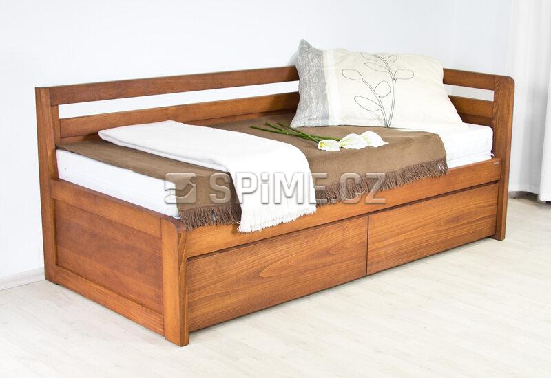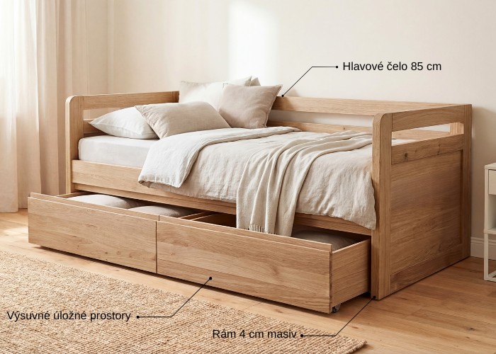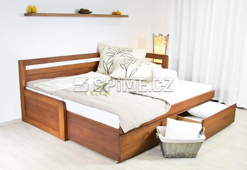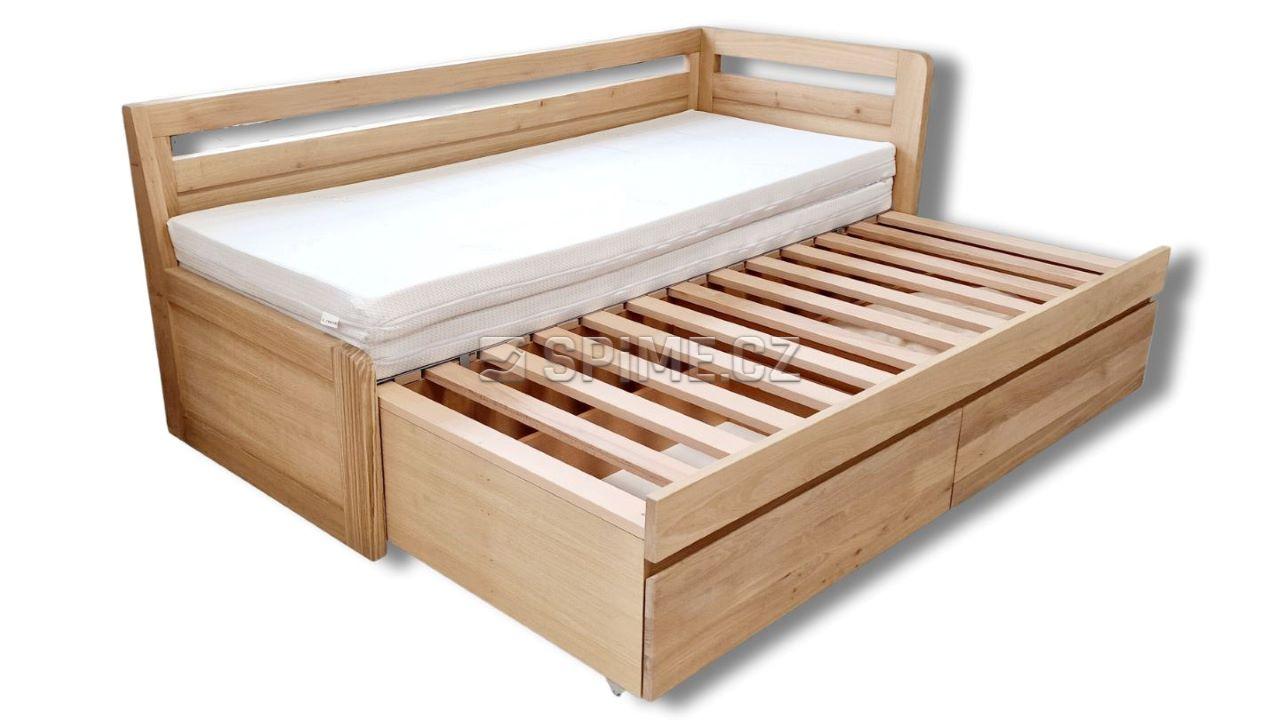 Rozkládací postel z masivu SOFA DUO-U s úložným prostorem a zvýšenými čely. Celomasivní dřevěná postel o šíři masivu 4 cm.