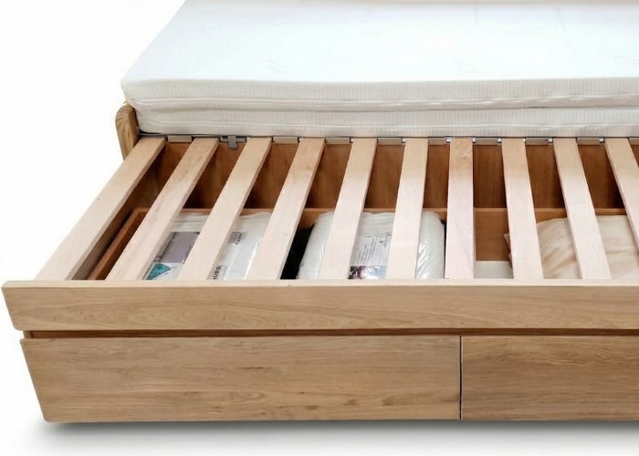 - Z masivu je tvořena většinová konstrukce postele včetně čel úložného prostoru.
