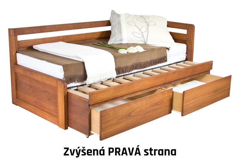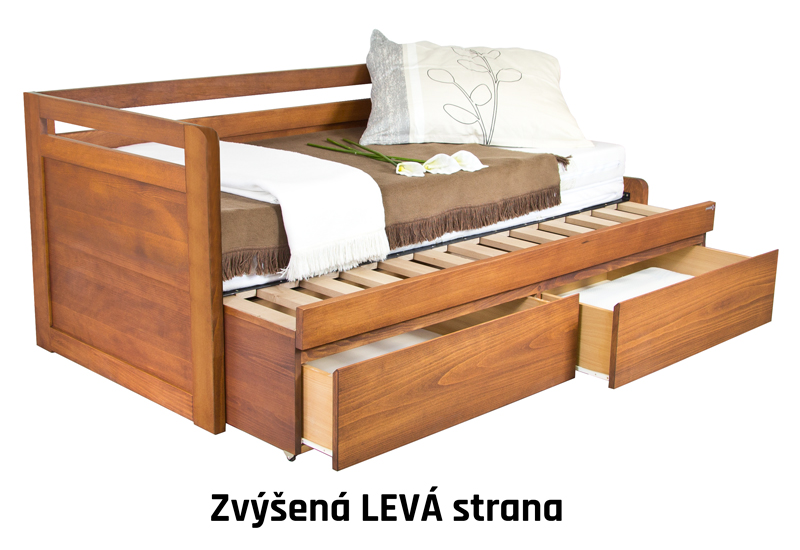 Rozkládací postel z masivu SOFA DUO L s úložným prostorem, zvýšené jedno čelo postele, volitelné zvýšení pravého, nebo levého čela. Masiv Buk, nebo s příplatkem Dub, Javor, Jasan.