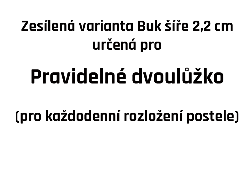 Základní laťkový rošt je určen pro použití postele jako Jednolůžko, příležitostné dvoulůžko. Zesílený bukový rošt šíře 2,2 cm je určen pro použití postele jako každodenní dvoulůžko.