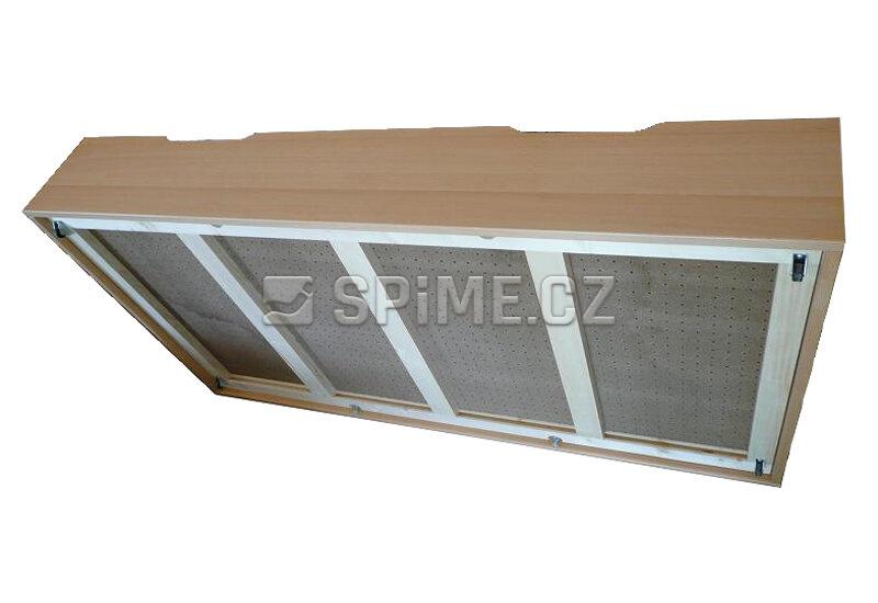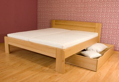 Úložný prostor - boční výsuv 100 cm se pohybuje na 4. kolečkách a je umístěn z boku postele. Přední deska s frézovanými úchyty je vždy tvořená tenčím masivem (dle vybraného dřeva) o šíři 2 cm a zadní část schovanou pod postelí (2x boční a 1x zadní deska) si můžete zvolit buď ze stejného masivního dřeva jako přední desku nebo v provedení masivní dýha. Dno do úložného prostoru je tvořeno akulitovou děrovanou deskou na dřevěné nosné ploché konstrukci. Tento úložný prostor je odjímatelná součást postele a nemontuje se k ní.