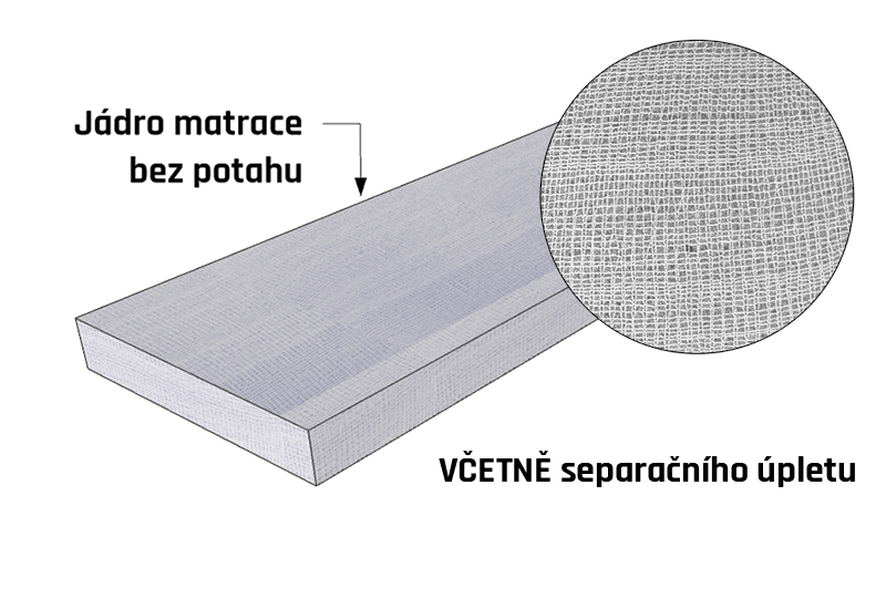 | Separační úplet: Separační úplet je vrstva elastické látky na jádru matrace, která odděluje(separuje) jádro od potahu. Jádro je vyrobeno z materiálů, po kterých potah neklouže, aby byl zajištěn pohyb potahu po jádru matrace, odděluje je tato separační látka. Látka má volný konec, aby šla z jádra sundat. | Ano |